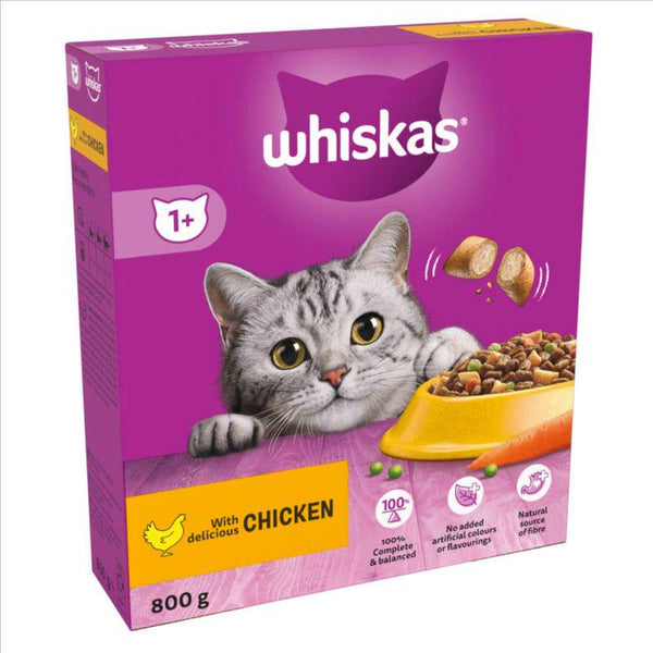 Whiskas 1+ Chicken helps to keep your adult cat healthy and full of vitality. The texture of this dry food helps to support your cat s dental health, as tartar is prevented from forming through the kibble s gentle abrasive effect.
